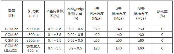 备注:每立方用量为2200kg/m³,包装为40kg防潮复合袋。施工时,CGM-55、CGM-60、CGM-80可以外加粒径为5~12mm的瓜片石,加入比例为:灌浆料:石子=100:(20~30),具体施工方法请向技术部咨询或索取详细技术说明书。